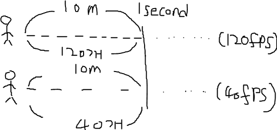만약 프레임당 10미터가 차이나면 PC성능이 좋아 초당 프레임을 120나오는 유저는