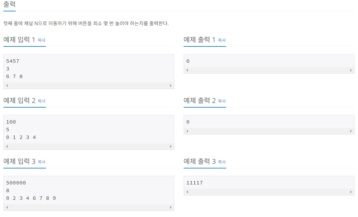 수빈이가 지금 이동하려고 하는 채널은 N이다. 어떤 버튼이 고장났는지 주어졌을 때, 채널 N으로 이동하기 위해서 버튼을 최소 몇 번 눌러야하는지 구하는 프로그램을 작성하시오.