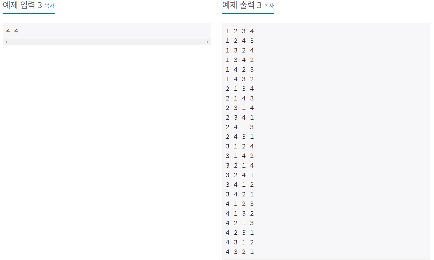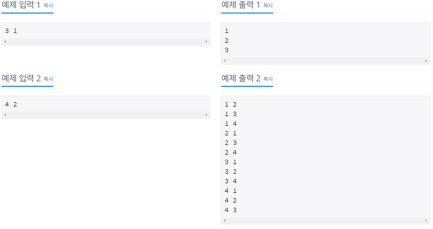 첫째 줄에 자연수 N과 M이 주어진다. (1 ≤ M ≤ N ≤ 8)