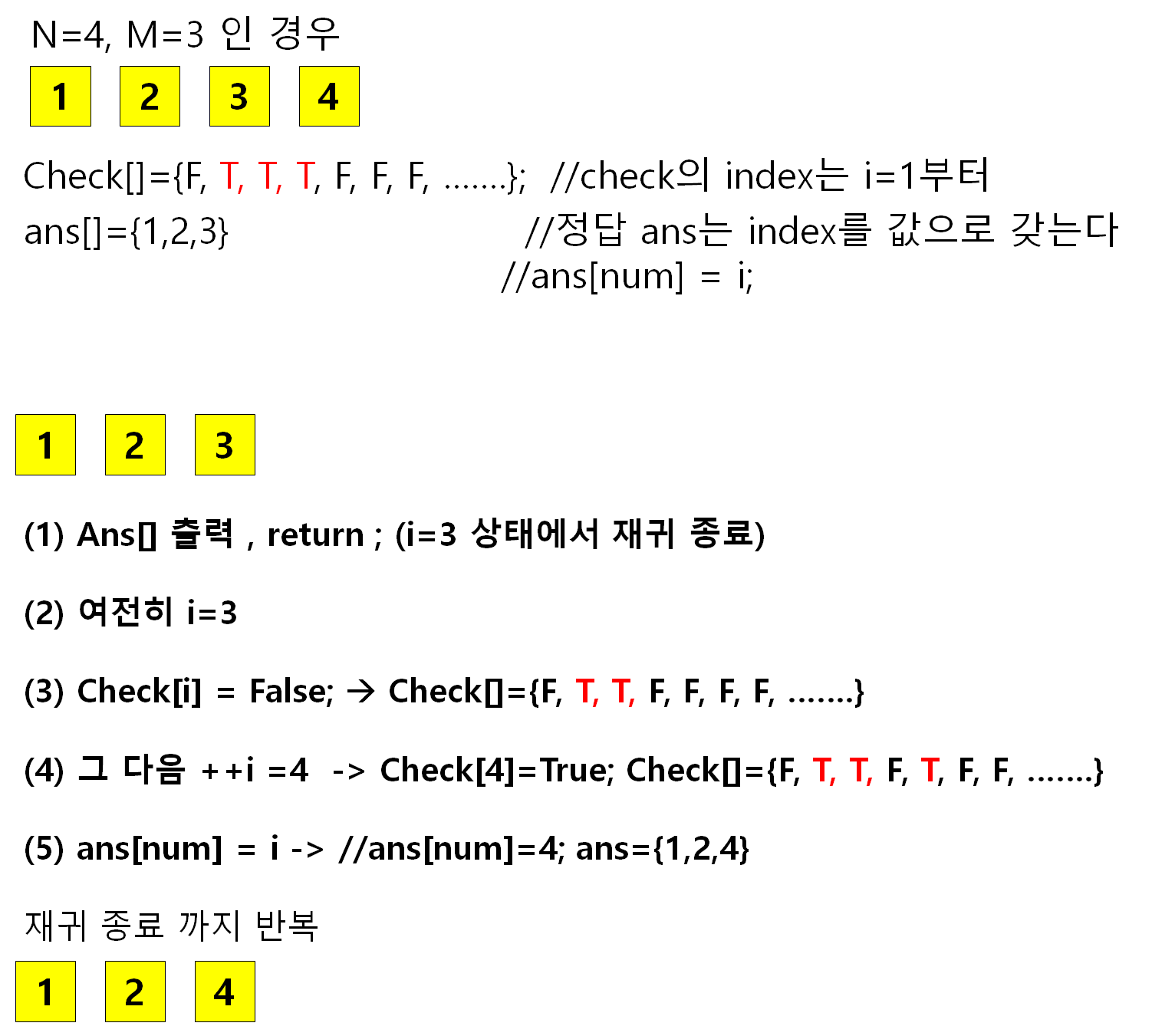 - 1부터 N까지 자연수 중에서 중복 없이 M개를 고른 수열