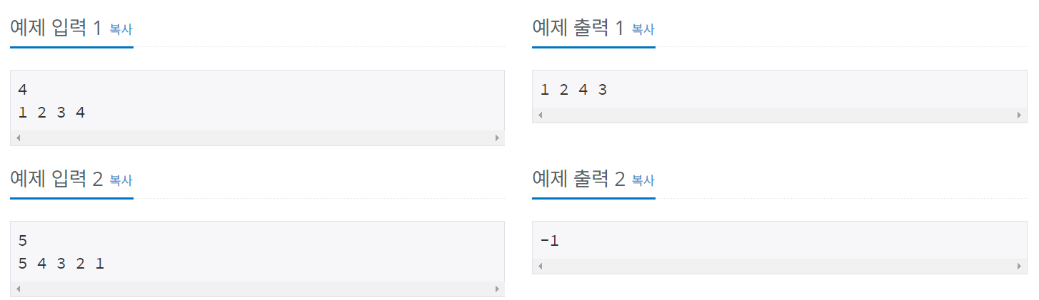 첫째 줄에 입력으로 주어진 순열의 다음에 오는 순열을 출력한다. 만약, 사전순으로 마지막에 오는 순열인 경우에는 -1을 출력한다.