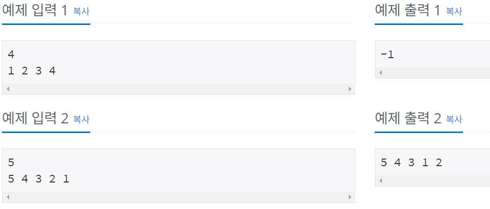 첫째 줄에 입력으로 주어진 순열의 이전에 오는 순열을 출력한다. 만약, 사전순으로 가장 처음에 오는 순열인 경우에는 -1을 출력한다.