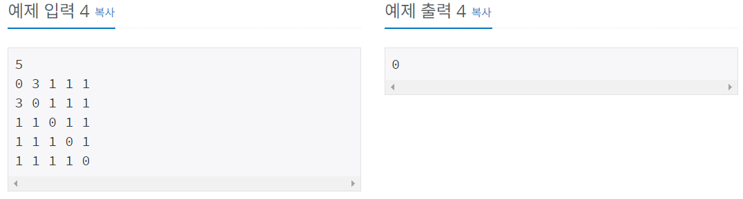 첫째 줄에 N(4 ≤ N ≤ 20)이 주어진다. 둘째 줄부터 N개의 줄에 S가 주어진다. 각 줄은 N개의 수로 이루어져 있고, i번 줄의 j번째 수는 Sij 이다. Sii는 항상 0이고, 나머지 Sij는 1보다 크거나 같고, 100보다 작거나 같은 정수이다.