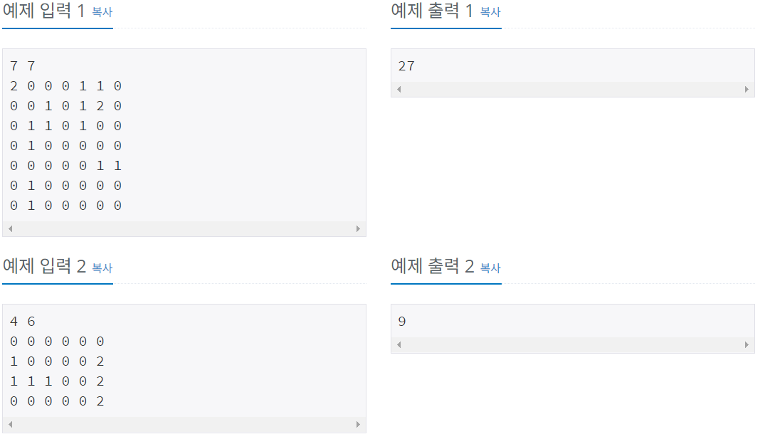 연구소는 크기가 N×M인 직사각형으로 나타낼 수 있으며, 직사각형은 1×1 크기의 정사각형으로 나누어져 있다. 연구소는 빈 칸, 벽으로 이루어져 있으며, 벽은 칸 하나를 가득 차지한다.