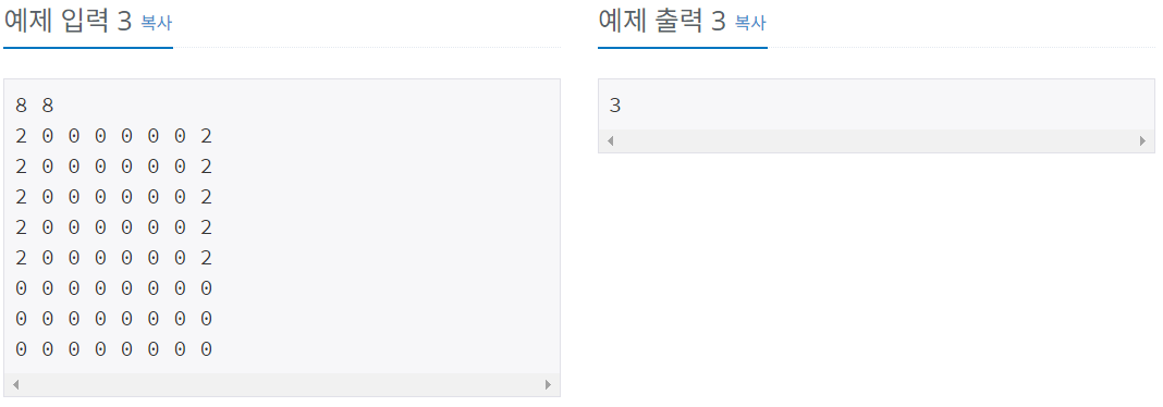 첫째 줄에 지도의 세로 크기 N과 가로 크기 M이 주어진다. (3 ≤ N, M ≤ 8)