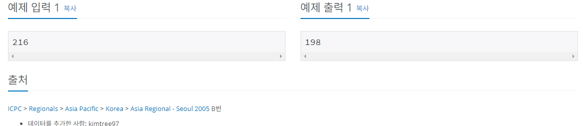 문제 어떤 자연수 N이 있을 때, 그 자연수 N의 분해합은 N과 N을 이루는 각 자리수의 합을 의미한다. 어떤 자연수 M의 분해합이 N인 경우, M을 N의 생성자라 한다. 예를 들어, 245의 분해합은 256(=245+2+4+5)이 된다. 따라서 245는 256의 생성자가 된다. 물론, 어떤 자연수의 경우에는 생성자가 없을 수도 있다. 반대로, 생성자가 여러 개인 자연수도 있을 수 있다. 자연수 N이 주어졌을 때, N의 가장 작은 생성자를 구해내는 프로그