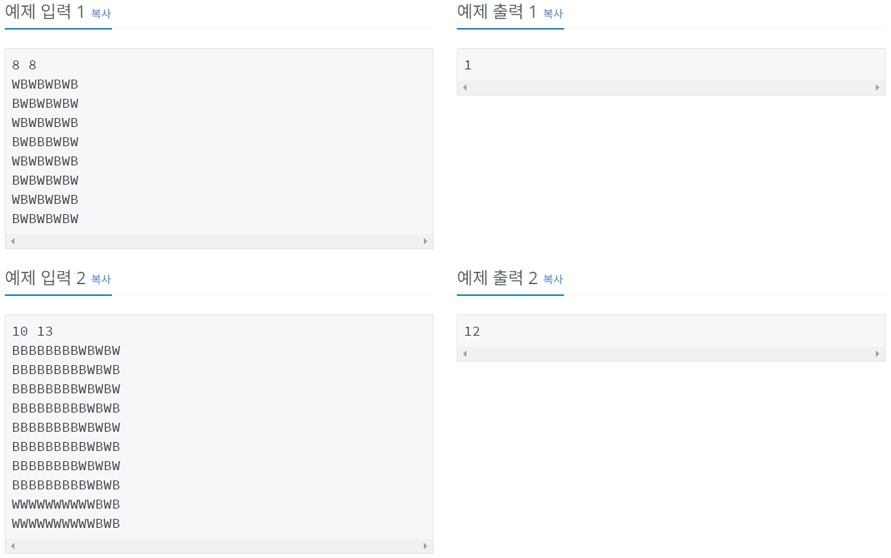 첫째 줄에 N과 M이 주어진다. N과 M은 8보다 크거나 같고, 50보다 작거나 같은 자연수이다. 둘째 줄부터 N개의 줄에는 보드의 각 행의 상태가 주어진다. B는 검은색이며, W는 흰색이다.