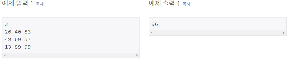 첫째 줄에 집의 수 N(2 ≤ N ≤ 1,000)이 주어진다. 둘째 줄부터 N개의 줄에는 각 집을 빨강, 초록, 파랑으로 칠하는 비용이 1번 집부터 한 줄에 하나씩 주어진다. 집을 칠하는 비용은 1,000보다 작거나 같은 자연수이다.