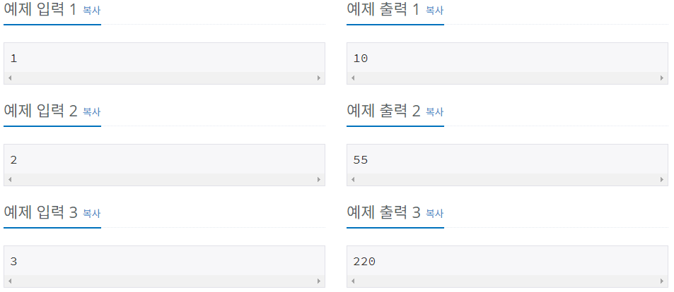 오르막 수는 수의 자리가 오름차순을 이루는 수를 말한다. 이때, 인접한 수가 같아도 오름차순으로 친다. 예를 들어, 2234와 3678, 11119는 오르막 수이지만, 2232, 3676, 91111은 오르막 수가 아니다. 수의 길이 N이 주어졌을 때, 오르막 수의 개수를 구하는 프로그램을 작성하시오. 수는 0으로 시작할 수 있다.
