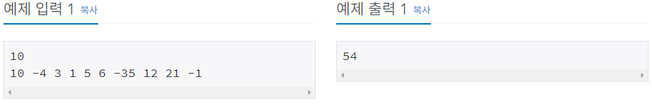 예를 들어서 10, -4, 3, 1, 5, 6, -35, 12, 21, -1 이라는 수열이 주어졌다고 하자. 여기서 수를 제거하지 않았을 때의 정답은 12+21인 33이 정답이 된다.