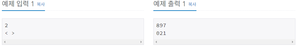 여러분은 제시된 부등호 관계를 만족하는 k+1 자리의 최대, 최소 정수를 첫째 줄과 둘째 줄에 각각 출력해야 한다. 단 아래 예(1)과 같이 첫 자리가 0인 경우도 정수에 포함되어야 한다. 모든 입력에 답은 항상 존재하며 출력 정수는 하나의 문자열이 되도록 해야 한다.