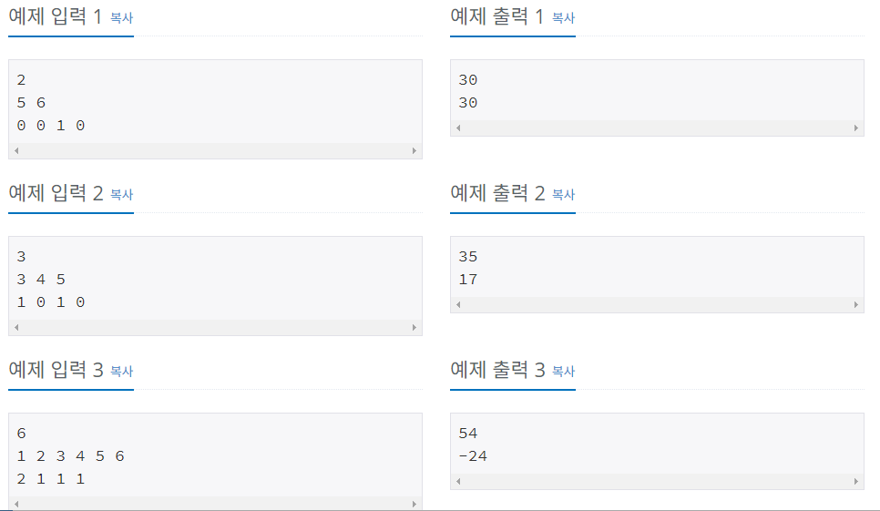 첫째 줄에 수의 개수 N(2 ≤ N ≤ 11)가 주어진다. 둘째 줄에는 A1, A2, ..., AN이 주어진다. (1 ≤ Ai ≤ 100) 셋째 줄에는 합이 N-1인 4개의 정수가 주어지는데, 차례대로 덧셈(+)의 개수, 뺄셈(-)의 개수, 곱셈(×)의 개수, 나눗셈(÷)의 개수이다.