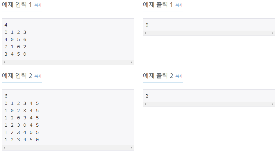 첫째 줄에 N(4 ≤ N ≤ 20, N은 짝수)이 주어진다. 둘째 줄부터 N개의 줄에 S가 주어진다. 각 줄은 N개의 수로 이루어져 있고, i번 줄의 j번째 수는 Sij 이다. Sii는 항상 0이고, 나머지 Sij는 1보다 크거나 같고, 100보다 작거나 같은 정수이다.