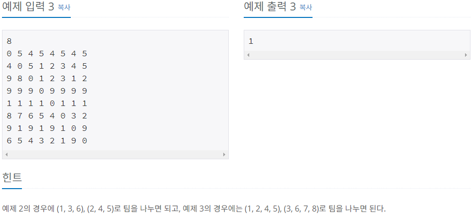 예제 2의 경우에 (1, 3, 6), (2, 4, 5)로 팀을 나누면 되고, 예제 3의 경우에는 (1, 2, 4, 5), (3, 6, 7, 8)로 팀을 나누면 된다.
