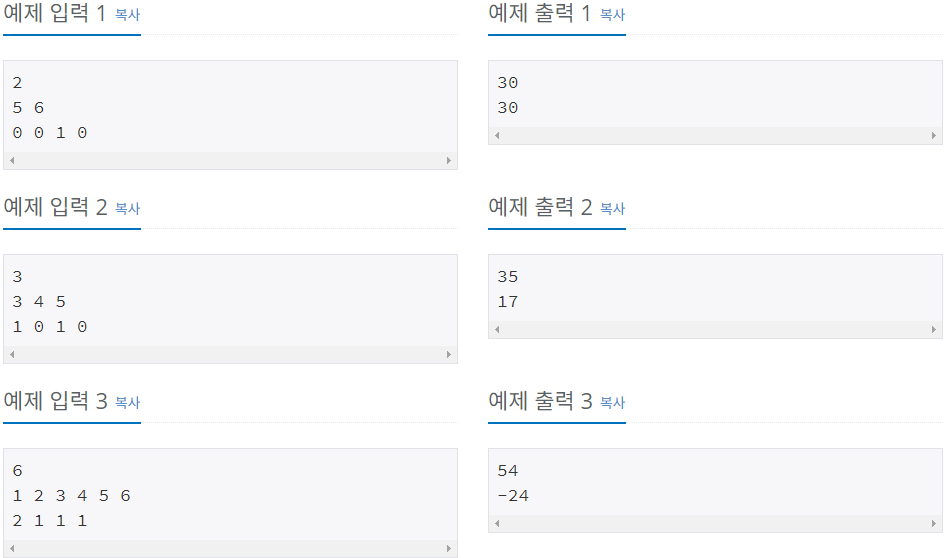 첫째 줄에 수의 개수 N(2 ≤ N ≤ 11)가 주어진다. 둘째 줄에는 A1, A2, ..., AN이 주어진다. (1 ≤ Ai ≤ 100) 셋째 줄에는 합이 N-1인 4개의 정수가 주어지는데, 차례대로 덧셈(+)의 개수, 뺄셈(-)의 개수, 곱셈(×)의 개수, 나눗셈(÷)의 개수이다.