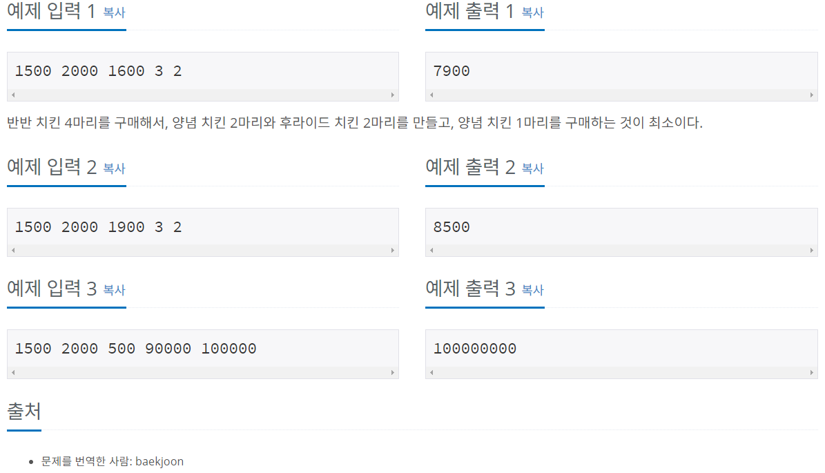 상도는 오늘 파티를 위해 양념 치킨 최소 X마리, 후라이드 치킨 최소 Y마리를 구매하려고 한다. 반반 치킨을 두 마리 구입해 양념 치킨 하나와 후라이드 치킨 하나를 만드는 방법도 가능하다. 상도가 치킨을 구매하는 금액의 최솟값을 구해보자.