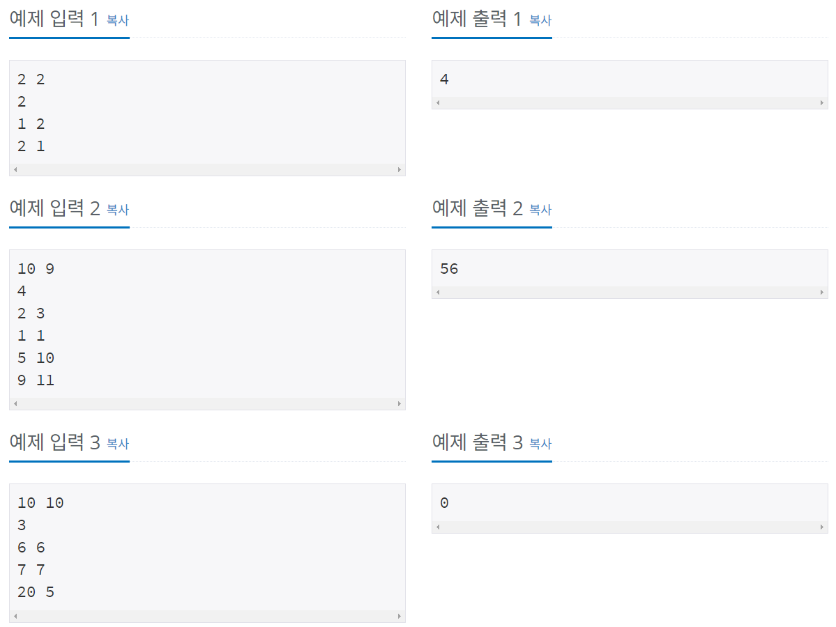 첫째 줄에 모눈종이의 크기 H, W, 둘째 줄에 스티커의 수 N이 주어진다. 다음 N개의 줄에는 스티커의 크기 Ri, Ci가 주어진다.
