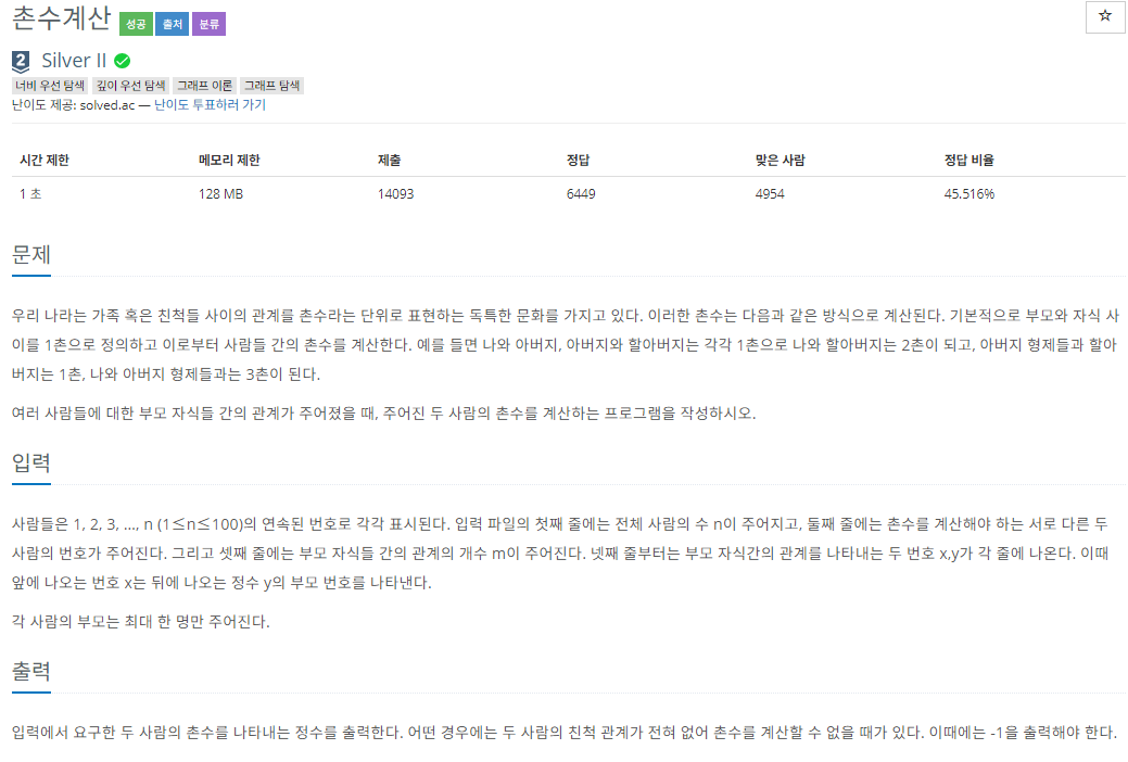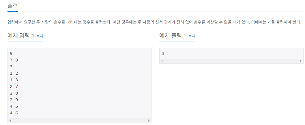 사람들은 1, 2, 3, …, n (1≤n≤100)의 연속된 번호로 각각 표시된다. 입력 파일의 첫째 줄에는 전체 사람의 수 n이 주어지고, 둘째 줄에는 촌수를 계산해야 하는 서로 다른 두 사람의 번호가 주어진�