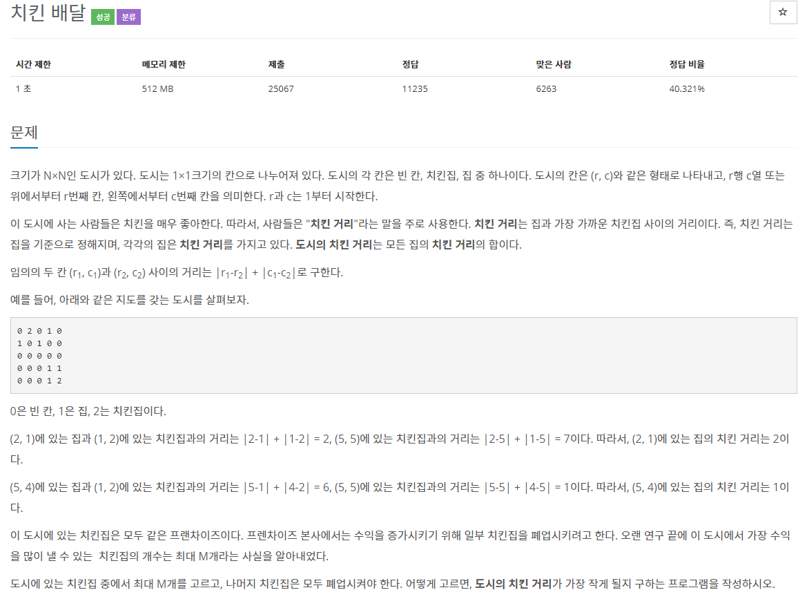 크기가 N×N인 도시가 있다. 도시는 1×1크기의 칸으로 나누어져 있다. 도시의 각 칸은 빈 칸, 치킨집, 집 중 하나이다. 도시의 칸은 (r, c)와 같은 형태로 나타내고, r행 c열 또는 위에서부터 r번째 칸