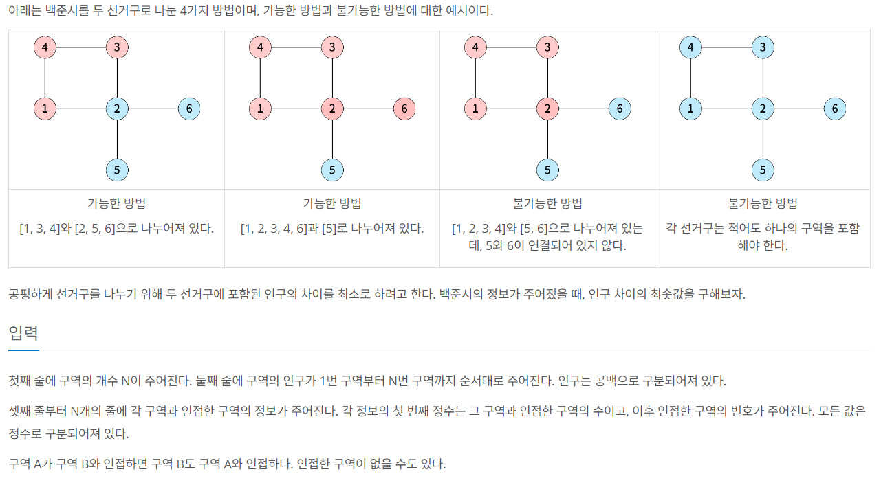 // 선거구에 포함되어 있는 구역은 모두 연결되어 있어야 함.