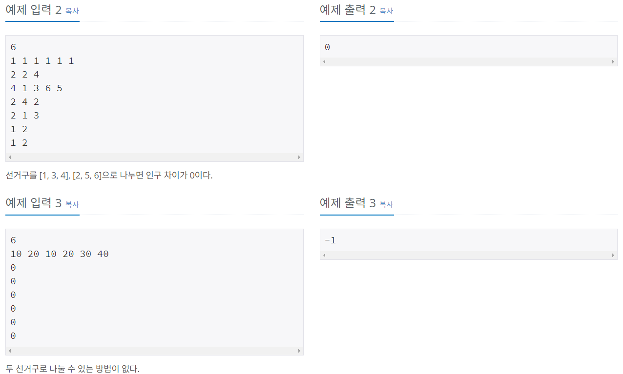 선거구를 [1, 4], [2, 3, 5, 6]으로 나누면 각 선거구의 인구는 9, 8이 된다. 인구 차이는 1이고, 이 값보다 더 작은 값으로 선거구를 나눌 수는 없다.