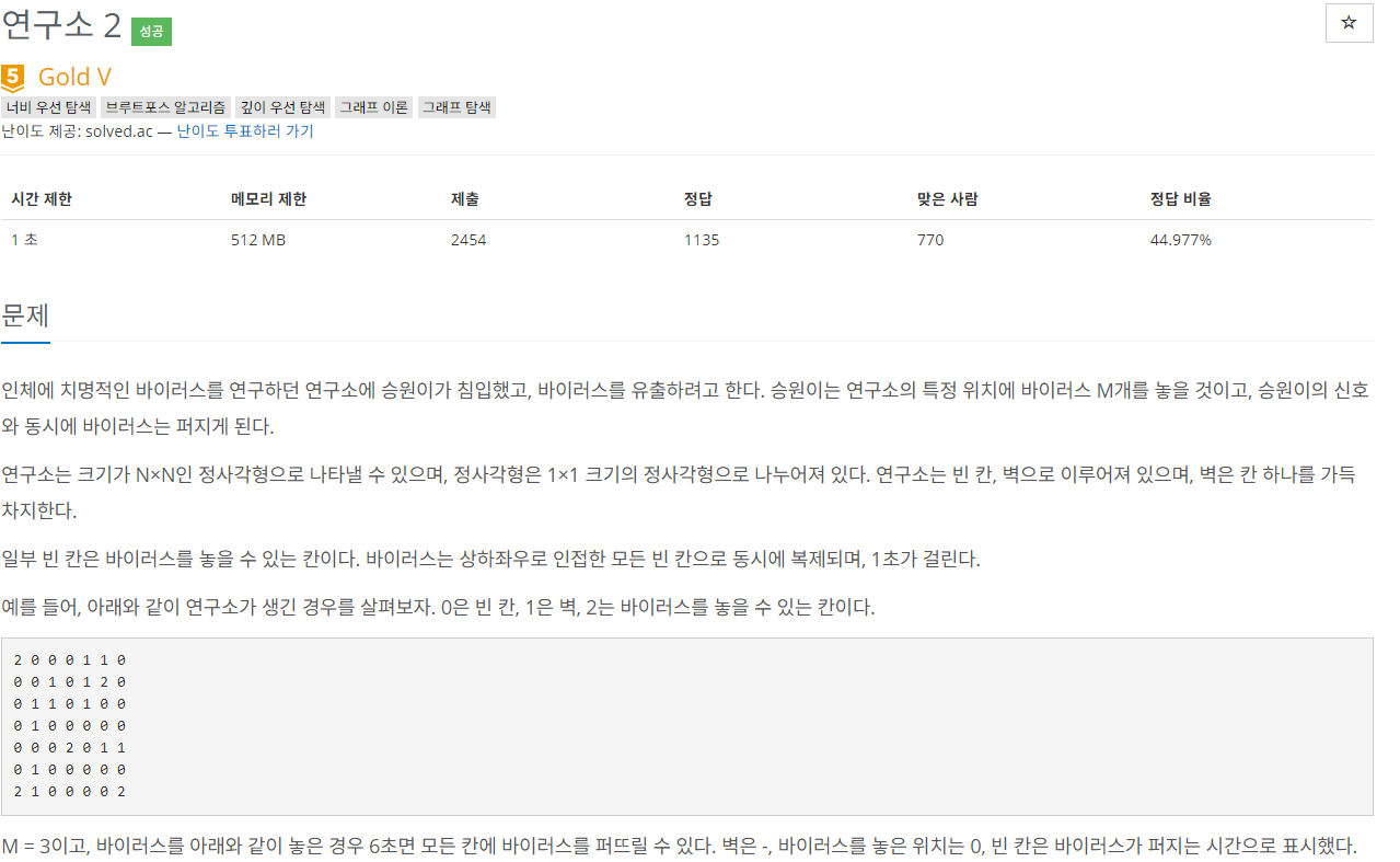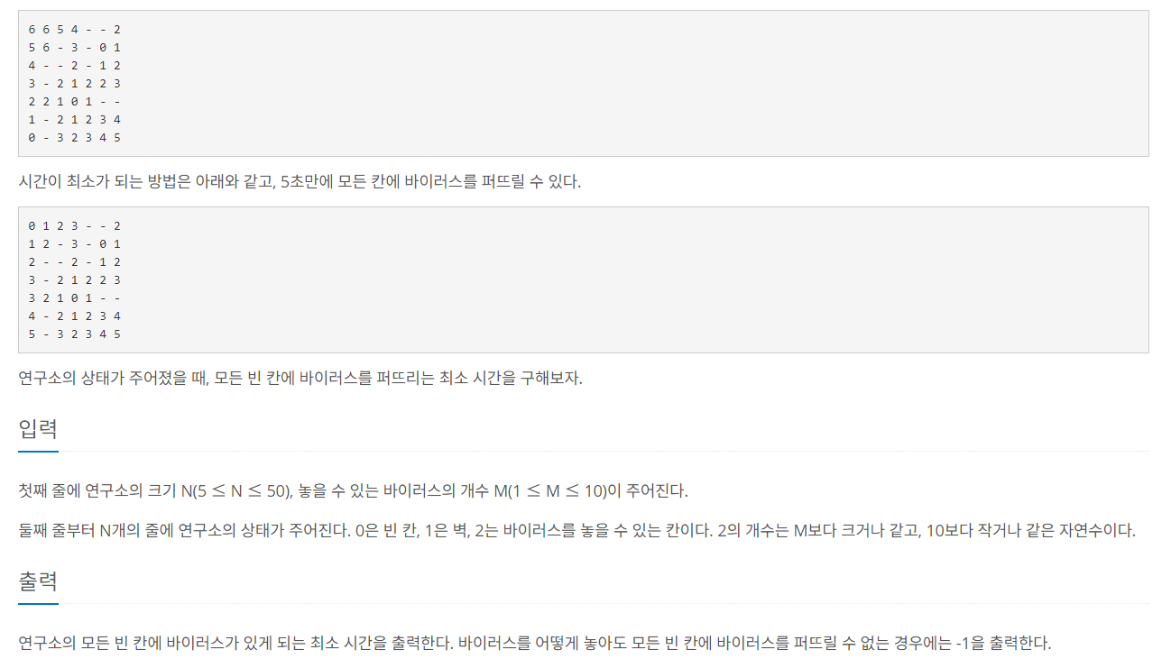 인체에 치명적인 바이러스를 연구하던 연구소에 승원이가 침입했고, 바이러스를 유출하려고 한다. 승원이는 연구소의 특정 위치에 바이러스 M개를 놓을 것이고, 승원이의 신호와 동시에 바이��