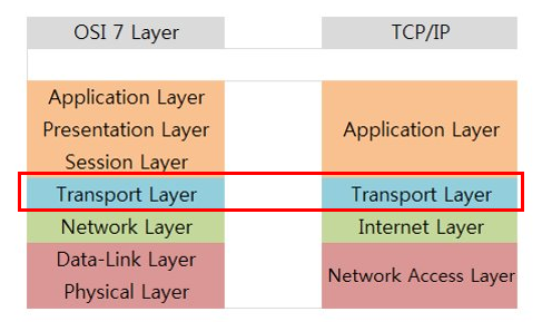 OSI계층에서 4 계층인 전송 계층(Transport Layer)에 속하며, 아래 그림에서 보이듯 Network 계층 위에서