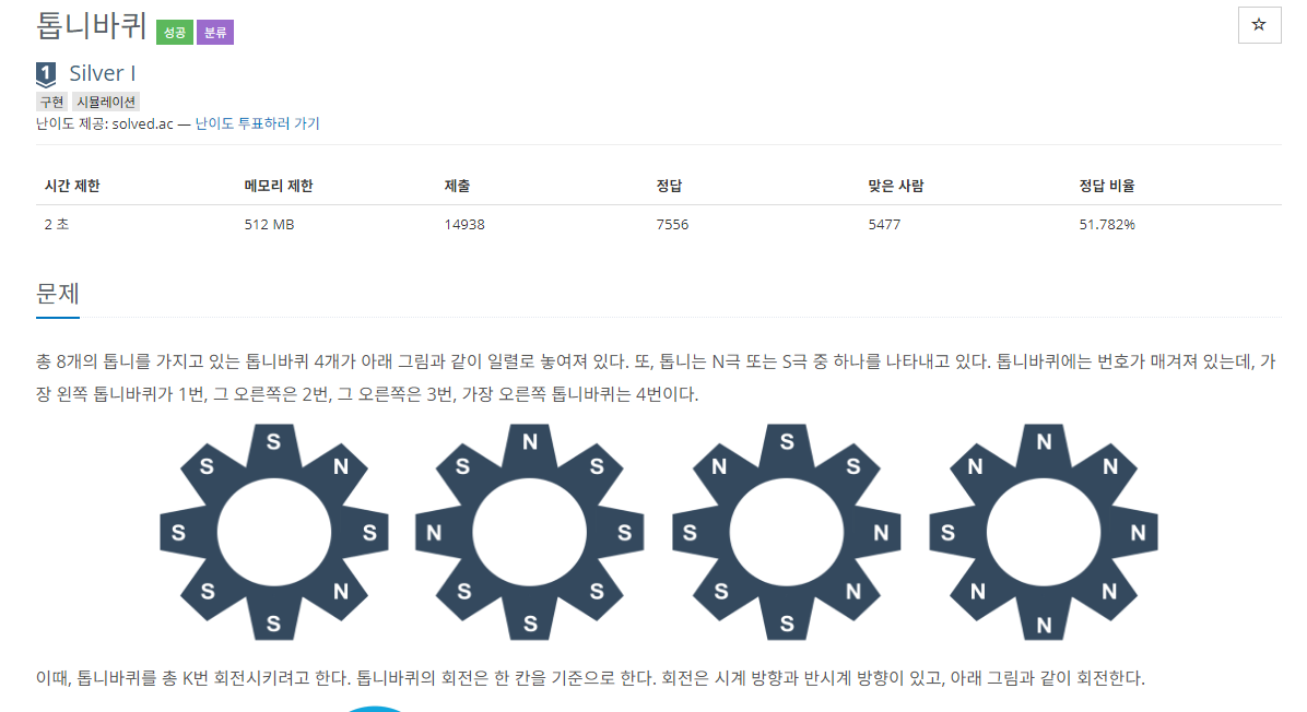 총 8개의 톱니를 가지고 있는 톱니바퀴 4개가 아래 그림과 같이 일렬로 놓여져 있다. 또, 톱니는 N극 또는 S극 중 하나를 나타내고 있다. 톱니바퀴에는 번호가 매겨져 있는데, 가장 왼쪽 톱니바퀴
