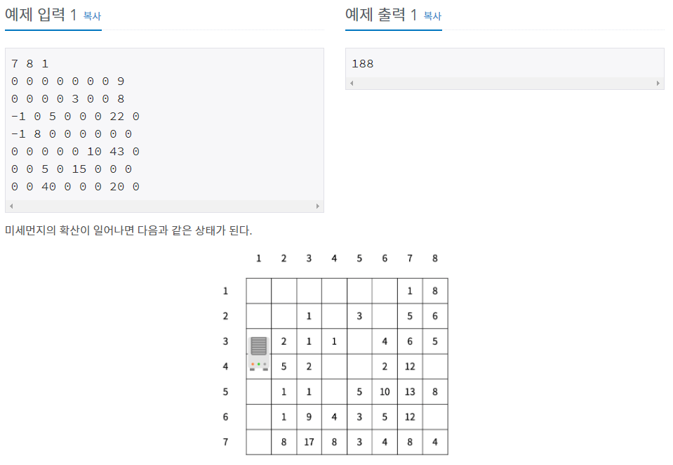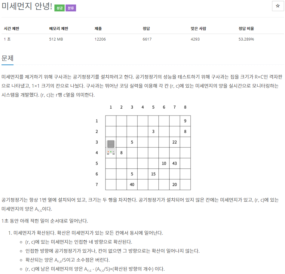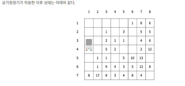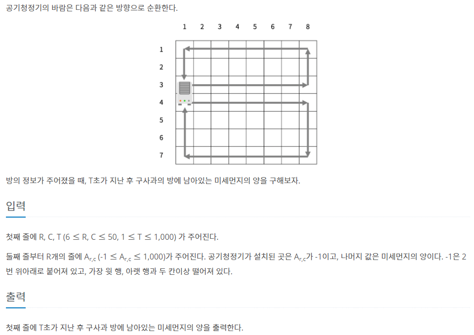 미세먼지를 제거하기 위해 구사과는 공기청정기를 설치하려고 한다. 공기청정기의 성능을 테스트하기 위해 구사과는 집을 크기가 R×C인 격자판으로 나타냈고, 1×1 크기의 칸으로 나눴다. 구사