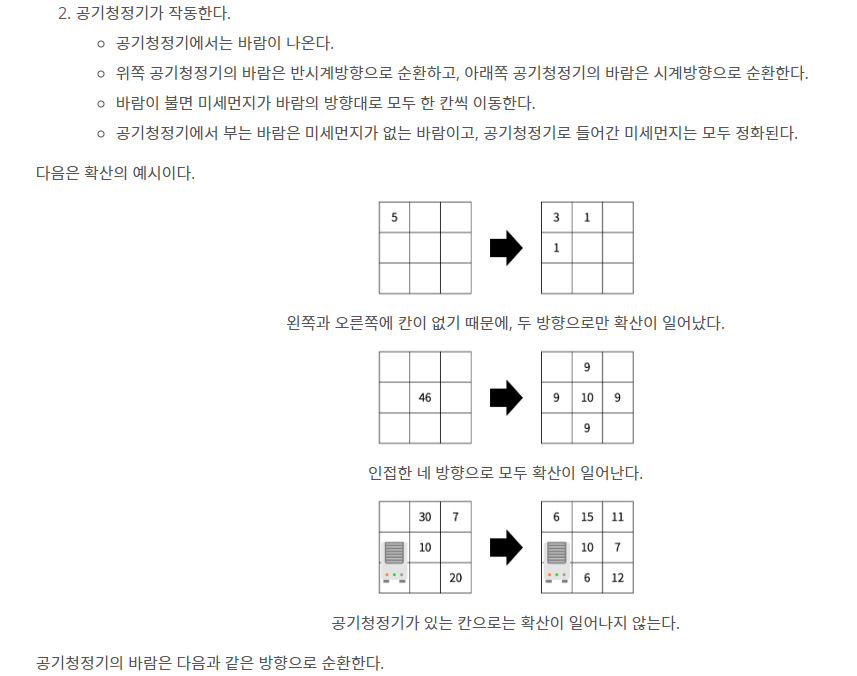 - 모든 먼지가 있는 칸에 확산되는 값들과, 감소되는 기존 미세먼지 중심의 감소값을 따로 Copy 배열을만들어 추가시키김 (r행,c열) 까지 검사가 끝난후 확산 값들의 누적 값을 기존 map에 더해준다.