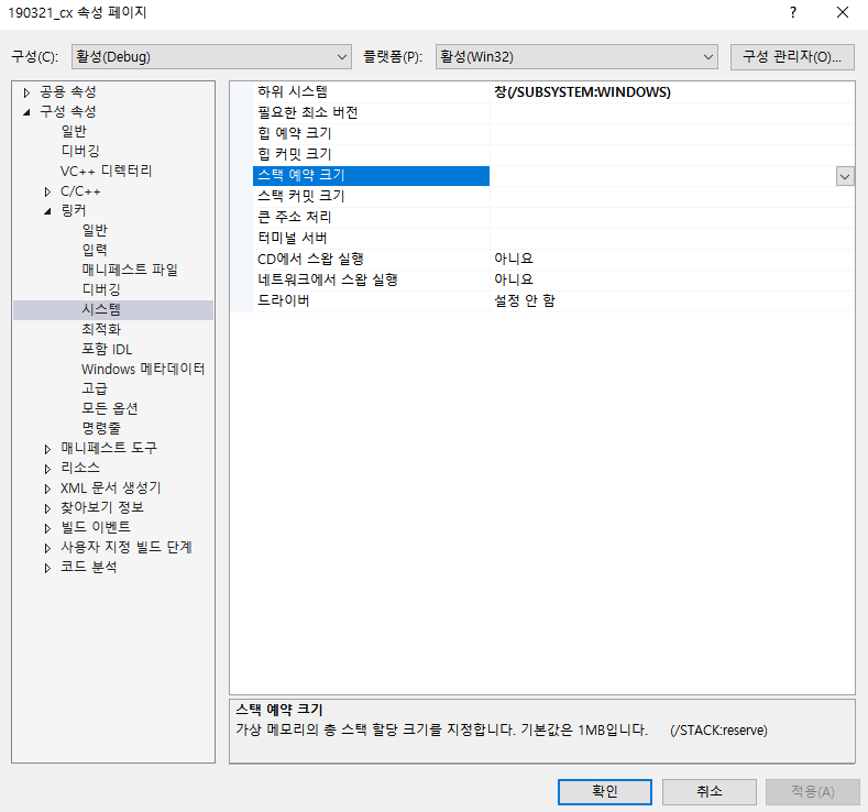 프로젝트 속성 - 구성 속성 - 링커 - 시스템 스택 예약 크기 및 조절.