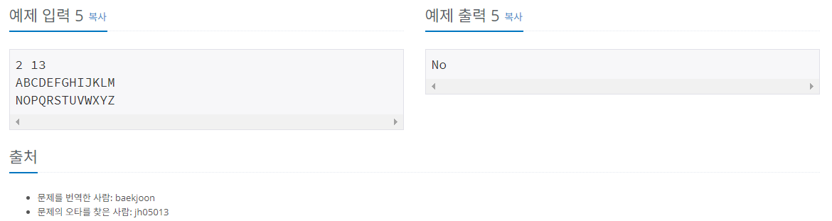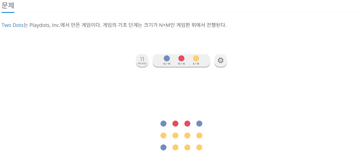 첫째 줄에 게임판의 크기 N, M이 주어진다. 둘째 줄부터 N개의 줄에 게임판의 상태가 주어진다. 게임판은 모두 점으로 가득차 있고, 게임판의 상태는 점의 색을 의미한다. 점의 색은 알파벳 대문자 한 글자이다.