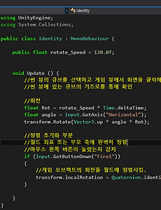 728x90 unity basic3 Throw 게임 오브젝트에 힘을 줘서 움직임을 만드는 방법. 게임 오브젝트에 힘을 주어 움직임을 만들려면 해당 게임 오브젝트에 물리 작용을 처리할 리지드바디(Rigdbody) 컴포넌트가 필요. [참고]6번재 줄의 힘을 달리하면 가해지는 힘의 양을 조절 하여 날아가는 거리를 조절 할 수 있다. 9번째줄의 백터값 또한 16번째줄의 힘과 백터값을 곱하기때문 날아가는 거리를 조절 할 수 있다. Vector3(각 x, y, z 축 방향) 위 코드는 800을 각 x , y 축으로 기존의 힘의 반으로 400의 힘으로 x, y 축으로 해당 오브젝트에 힘을가함.[참고] GetComponent로 Rigidbody를 불러와 AddForce 함수를 참조하여 AddForce의 매개변수에 연산된 백터 값을 넣어주면 해당 스크립트를 컴포넌트.. 2016. 12. 28. identity(회전 일치) 게임에서 회전을 많이 한 다음에 초기화를 통해 월드의 방향과 회전을 일치시킨다거나 A의 회전과 B의 회전을 일치시키기 위한 방법이 필요하다. 이럴 때 사용하는 것이 Quaternion.identity를 이용한 정렬. (상자 회전 전)(키보드 (우) 키를 누르면서 박스를 회전)(박스가 회전한 이후 마우스로 화면을 클릭하면 다시 원위치로) 2016. 12. 27. Rotate 게임의 기본동작 회전 7번째 줄 : 트랜스폼(transform)중 초기 회전(rotation) 값을 지정한다. 오일러각(Euler Angle)을 이용해 지정. 11번째 줄 : 트랜스폼(transform)중 초기 회전(rotation)값을 지정한다. 9번째 줄에서 쿼터니안값(Quaternion)을 만들고 이를 이용해 지정. 13번째 줄 : 트랜스폼(transform)중 회전 값을 현재 값에서 지정한 값만큼 회전(Rotate) 시킨다. * 7번째 줄의 코드가 실행됐을때 Y축으로 50도 회전한 값이 초깃값으로 지정된다. 11번째 줄의 코드가 실행됐을때 Y축으로 100도 회전한 값이 초기 값으로 다시 지정된다. 13번째 줄의 코드가 실행됐을때 Y축으로 90도 회전하는 동작이 일어난다. 결과적으로 Y축 각은 50.. 2016. 12. 27. 이전 1 다음 728x90